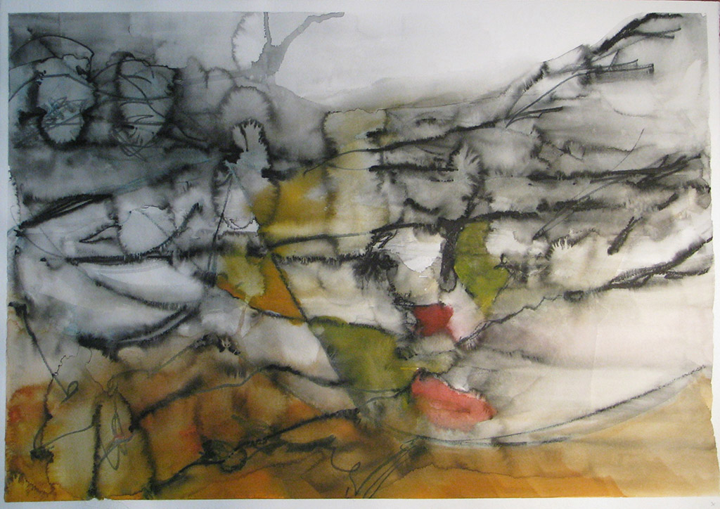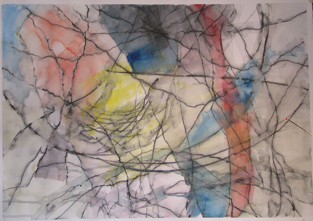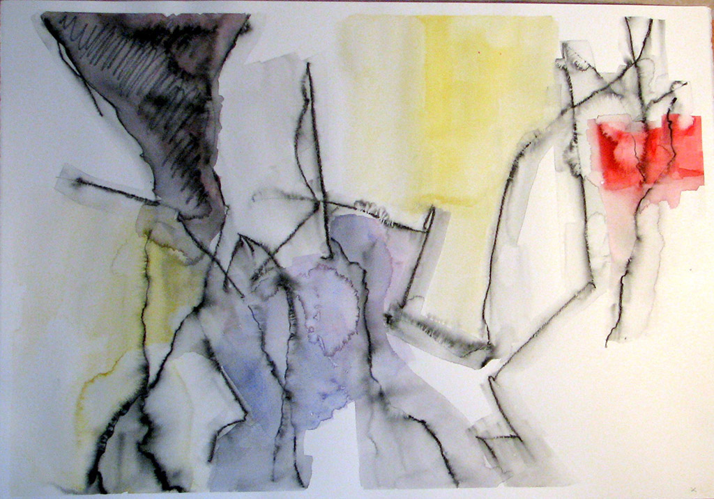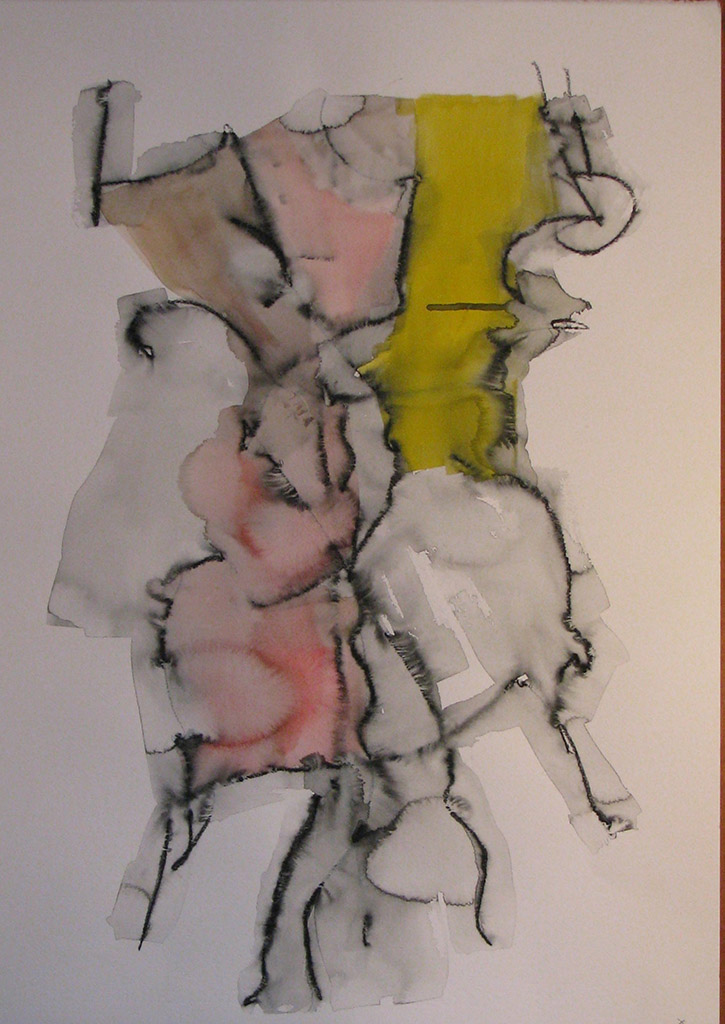 E’ questo il discrimine tra l’ “artista”e l’ “artista della domenica”. Il primo parla per l’altro, con l’altro. II secondo parla di sé e per sé. Attraverso ripetute prove, l’artista prende possesso del segno o , meglio, “sta alla pari” con il segno nel suo farsi. Occoffer ci parla da artista. Ora il reale riemerge in una forma nuova e inedita. Nelle carte del 2009, il nucleo immaginifico che emerge è quello del corpo e della figura anatomica. Il tema per eccellenza degli studi accademici! La tecnica di questi disegni è l’acquerello, con rari interventi di tempera e matita acquerellata o più raramente, acrilico su carta. E’ una tecnica rapida e difficile, perché si misura con l’imprendibilità dell’acqua. Occoffer lascia andare il segno sulla superficie e poi stende l’acqua con il pennello piatto, controllando il farsi delle macchie , la dilatazione del colore liquido, le isole d’acqua, le trasparenze e gli addensamenti che formano i volumi, le ombre, gli sbafi, i rivoli. Il peso del segno trattiene o si sgretola lasciando tracimare la materia liquida, prima che la carta la trattenga e l’assorba, la solidifichi nella figura. La figura umana è inconscia ed emerge con la forza del modello. A volte in dettagli anatomici che si dilatano sino ad apparire paesaggi, echi dei paesaggi dai quali i primi lavori di Occoffer nascevano. In alti casi , a mio parere i più suggestivi ed inquietanti , emerge la figura accademica, la postura di un braccio sollevato sopra la testa e ripiegato dietro la nuca, che offre la figura allo sguardo che sa rintracciare l’esibizione della posa, nel groviglio del segno. Ma ancora colpisce come dal disegno automatico le suggestioni culturali dello sguardo si impongano a comporre scenari che affondano le loro radici in codici visivi acquisiti. In una serie di carte, in cui la composizione è più fitta e satura di colore, il segno compone campiture che trattengono aree di colore, richiamando le vetrate gotiche: dall’idea del corpo germoglia il canone dell’architettura e dall’architettura nuovamente, il paesaggio. Il segno nei lavori che Giorgio Occoffer ci presenta si è trasformato in sguardo.